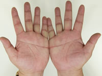 はっきりと濃く、左右全く同じ手相が、一直線に繋がる。生まれ持ってのものだ。